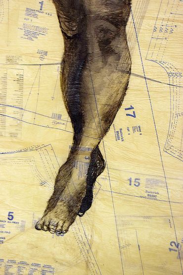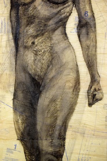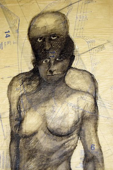 Naked Lilith, standing with clenched fists and staring at the viewer is drawn with charcoal and ink on sewing patterns made of thin tissue paper.