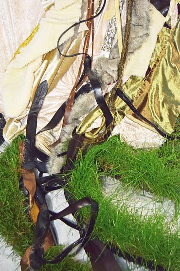 worn out ritual fabrics, velvet, leather, animal fur, paint, string, sewing pins, staples