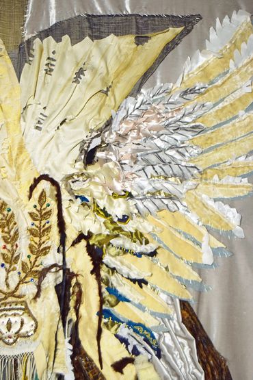“Holy Holy Holy” series brings to mind a winged figure. It references the practice to envision ourselves as angels as we pray in an effort to concentrate on the transcendent rather than on the earthly. These large pieces are made from discarded ritual fabrics that had been used for years in one of Chicago’s oldest Jewish congregations. Over time, velvet tallit and t’fillin bags embroidered with floral designs wore out and were put aside to be buried. The beauty and richness of the decaying materials, embroidered dedications and initials, old remnants of paper, and wine stains echo sacred moments of awe and private and communal joyous celebrations and sad commemorations. To recreate the sense of this fragile spirituality and awe, I disassembled the bags and re-attached them, adding pieces of leather, silk, and velvet, then stapled the pieces together into a delicate tapestry.