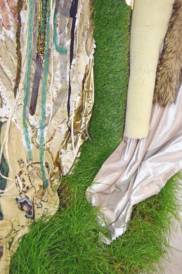 worn out ritual fabrics, velvet and silk, leather, staples, canvas cutouts, live plants.